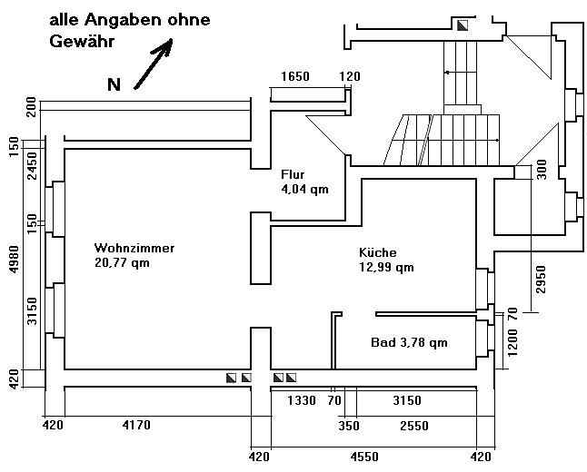 1 Raum-Wohnung in Dorfidylle. Bad und Küche haben ein Fenster und sind gefließt, die weiteren Räume sind mit Laminat ausgestattet und werden weiß gespachtelt.