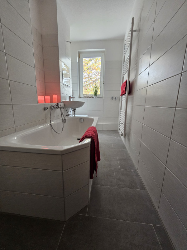 - ein modernes Bad mit Wanne sowie Handtuchheizkörper